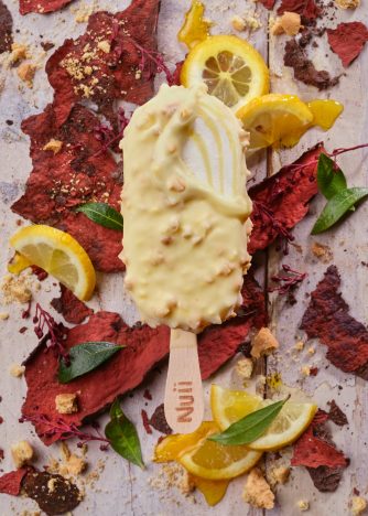 Ein intensives Yuzu-Zitronen-Sorbet verstrudelt mit cremigem Eis mit Frischkäse, umhüllt von köstlicher weißer Schokolade mit knusprigen Keksstückchen.