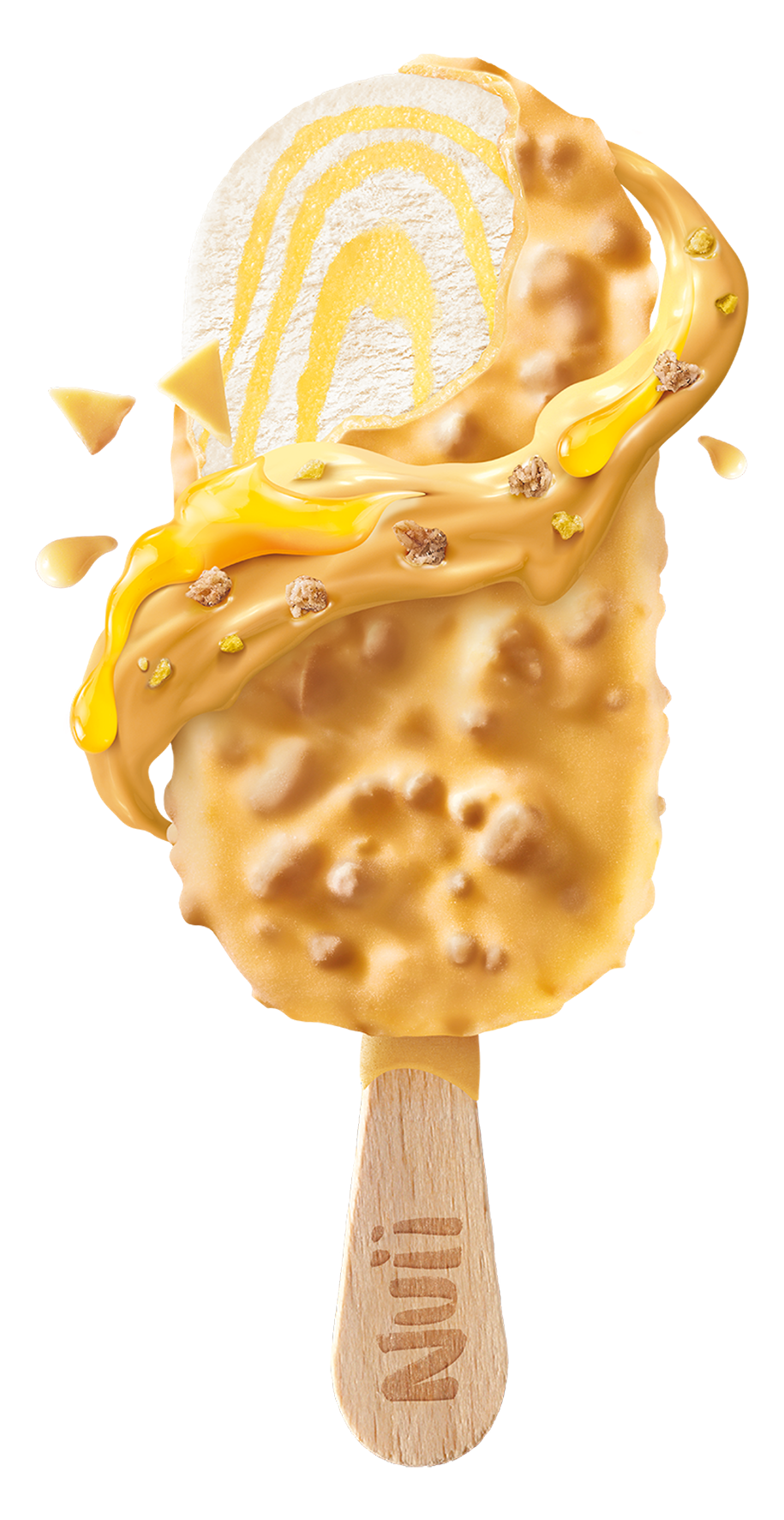 Ein intensives Yuzu-Zitronen-Sorbet verstrudelt mit cremigem Eis mit Frischkäse, umhüllt von köstlicher weißer Schokolade mit knusprigen Keksstückchen.