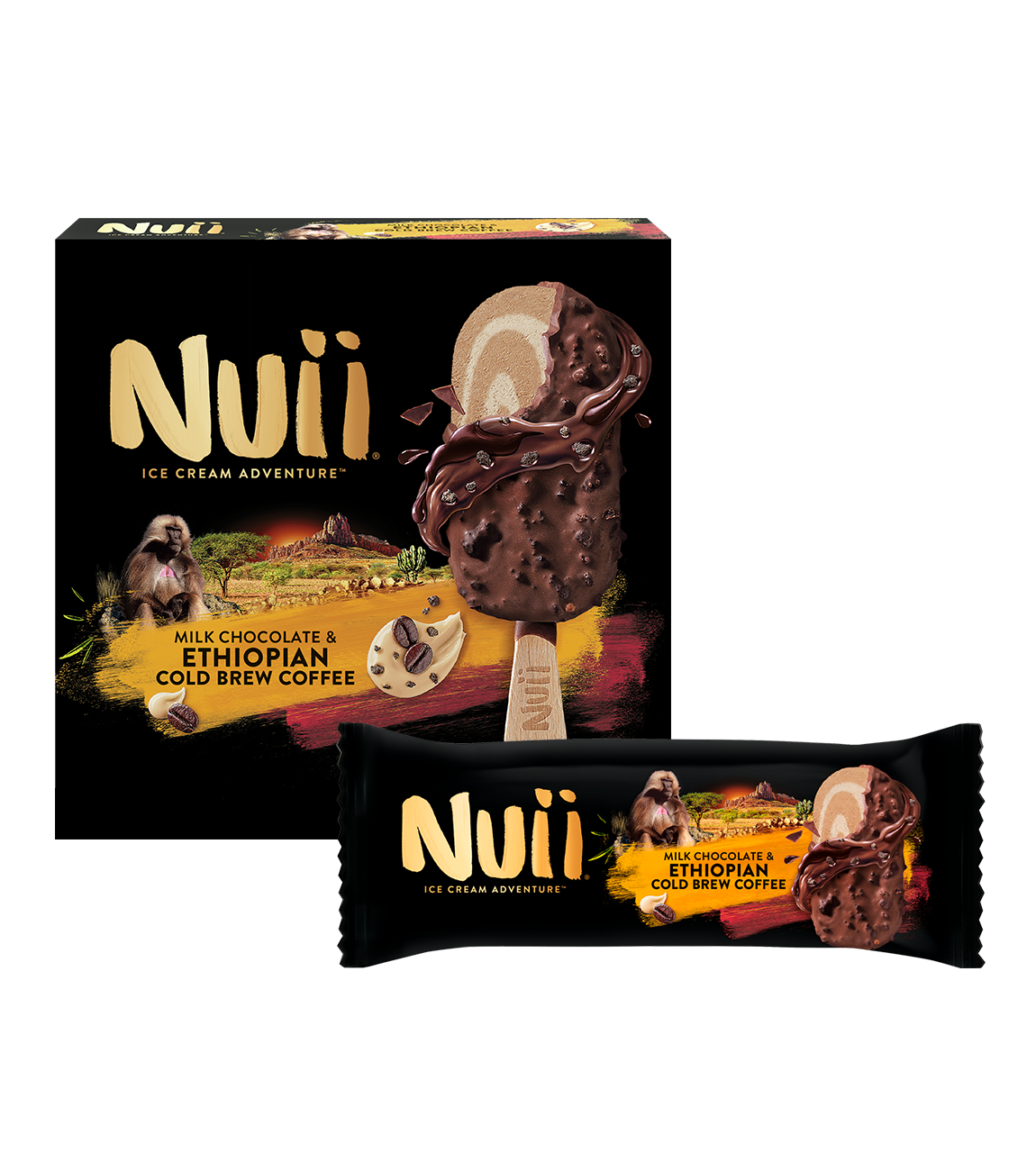 Cremiges Kaffee-Eis, hergestellt mit äthiopischem Cold Brew Coffee, trifft auf zartes Eis mit Mandelgeschmack. Umhüllt wird das Ganze von köstlicher Milchschokolade, veredelt mit knusprigen Kakaokeksstückchen und karamellisierter Kaffee.